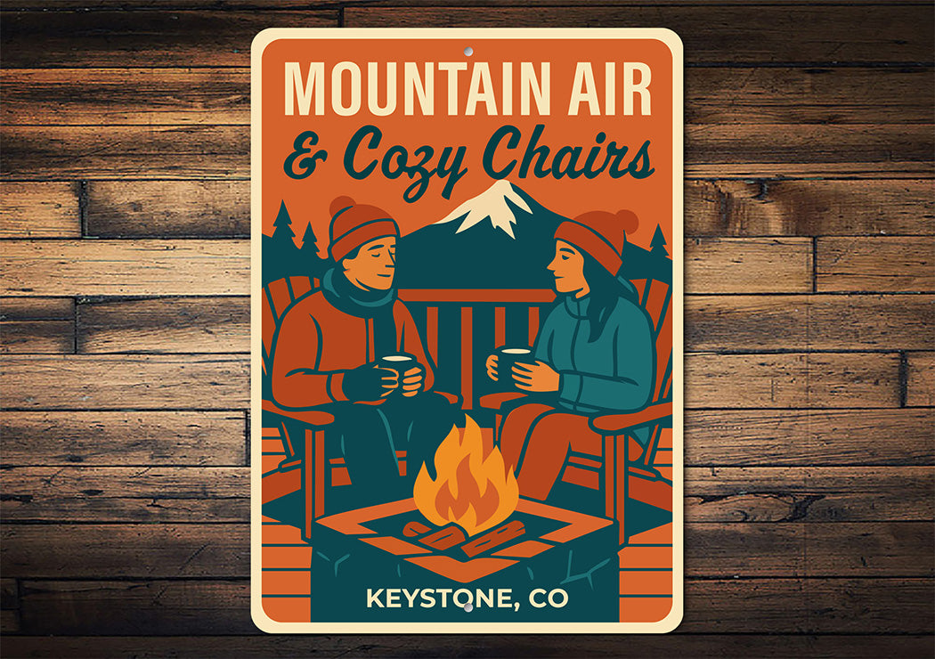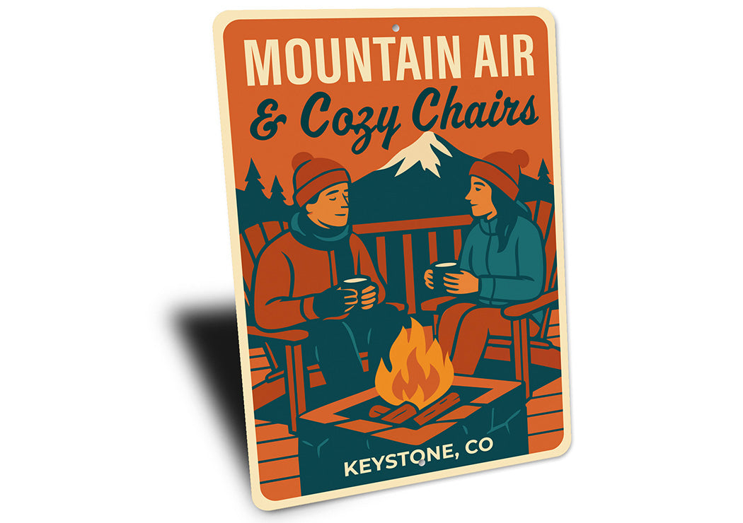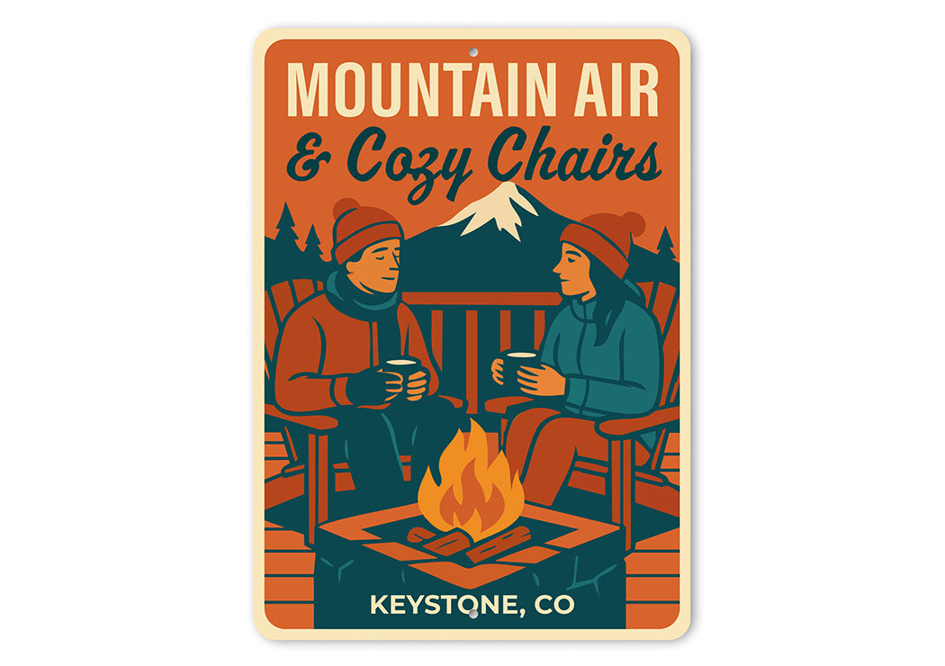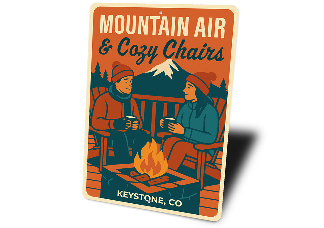 Breathe in the alpine charm with this Mountain Air & Cosy Chairs - Keystone, CO aluminum sign. Featuring rustic mountain typography, this piece perfectly captures the relaxing après-ski vibe of Colorado's premier ski destination.