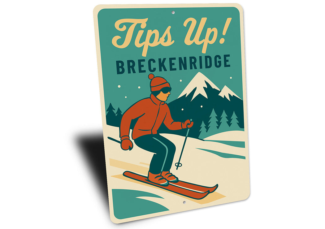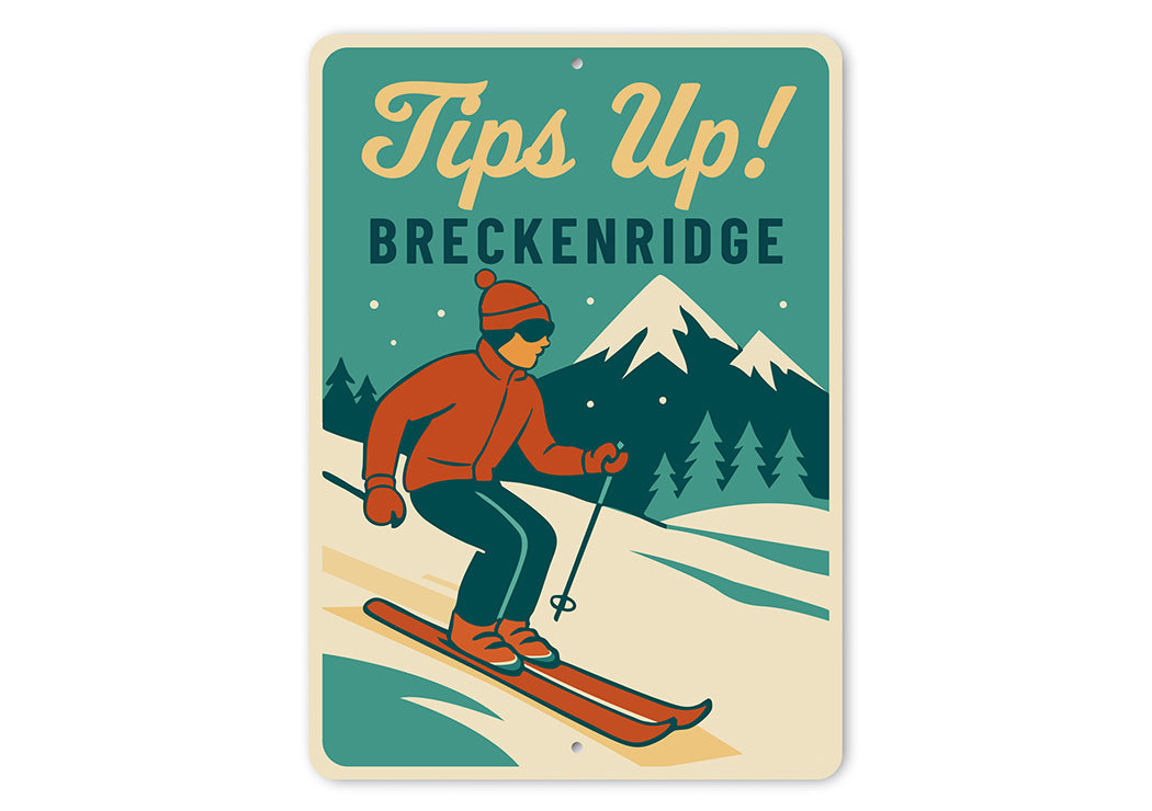 Celebrate Breckenridge's ski culture with this playful Tips Up! aluminum sign. Featuring bold, retro-inspired typography, this charming piece captures the carefree spirit of Colorado's iconic mountain town with its classic ski slang.